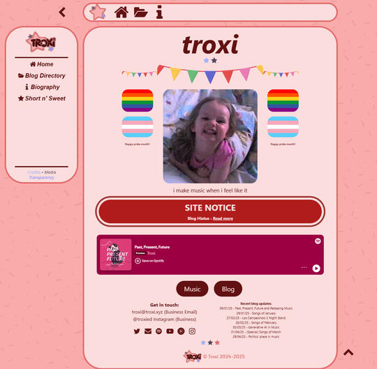Troxi.xyz is a small personally-owned music blog made to share small, queer, and otherwise unknown music. Commentating with sharp wit, Troxi devotes the blog to picking 5 songs a month to write about in detail, as well as picking an industry-related event, performance, or artist to uplift. Proving itself, Troxi.xyz has a dedicated team of the site writer/manager and site programmer/developer to manage the blog, including checking user statistics, making new developments for the site's plugins, and providing important input on the future of the site.OR,